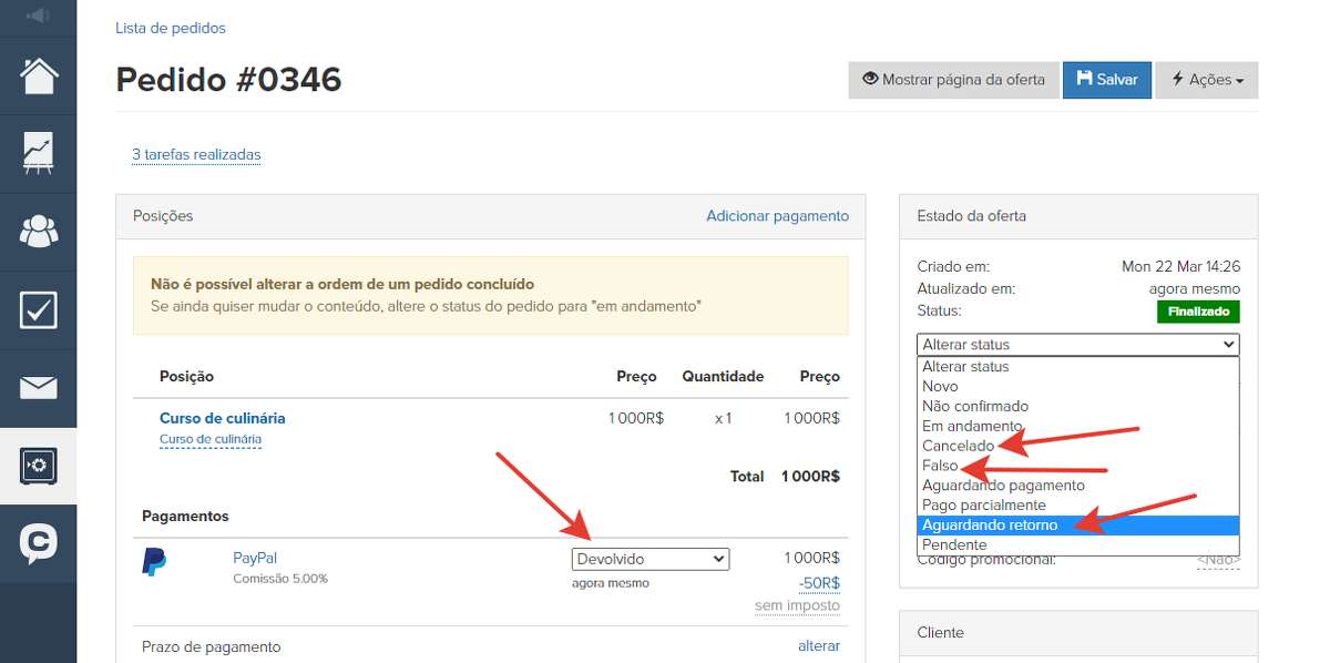 Você pode fazer um reembolso no sistema de pagamento em que o pagamento foi feito e, na GetCourse, alterar o status do pagamento para "Reembolsado" e o status do pedido para "Cancelado", "Falso" ou "Aguardando reembolso". Não esqueça de clicar em "Salvar".