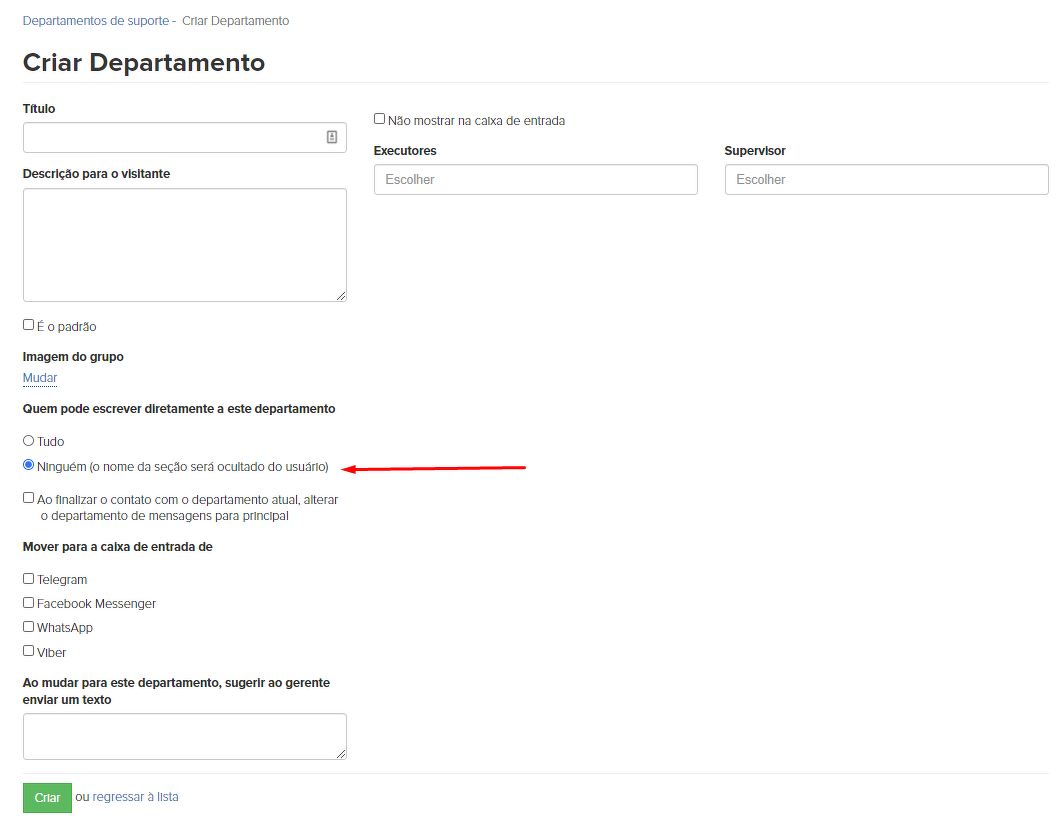 É possível criar seções internas de solicitação indisponíveis aos usuários no sistema, por exemplo, para o redirecionamento de mensagens entre colaboradores e aumento na eficácia e velocidade de processamento das solicitações. Para realizar essa tarefa, nas configurações da seção, no gráfico "Quem pode escrever diretamente para essa seção", passe o seletor para a posição "Ninguém".