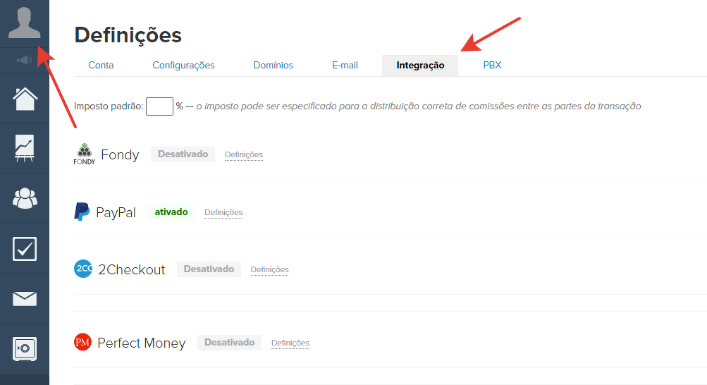 Confira a lista de sistemas de pagamento disponíveis para integração na seção "Perfil" - "Configurações da conta" na aba "Integração".