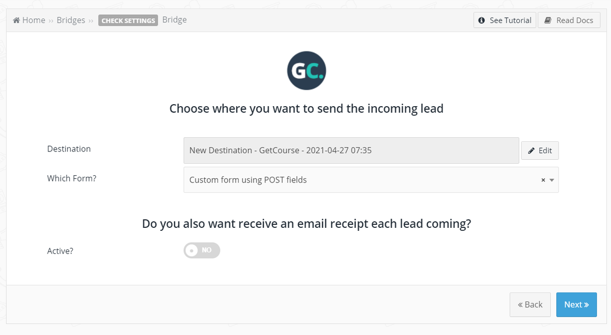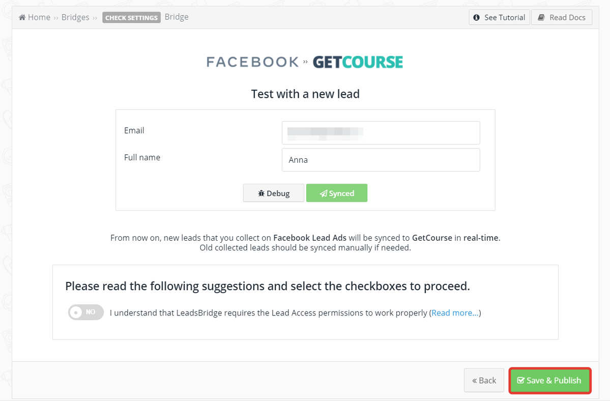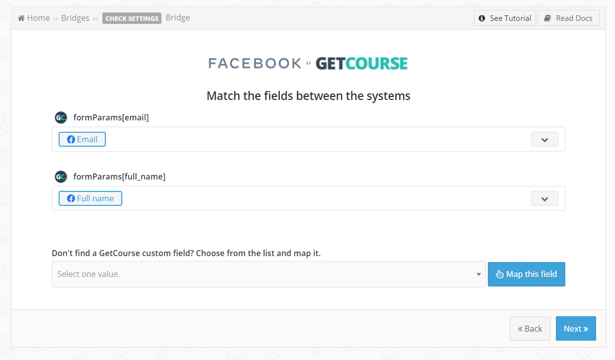 O serviço da Leadsbridge permite que você automatize a transferência de dados do cadastro de usuários do Facebook para sua conta do Facebook na GetCourse e configure, por exemplo, um mailing automático para esses usuários.