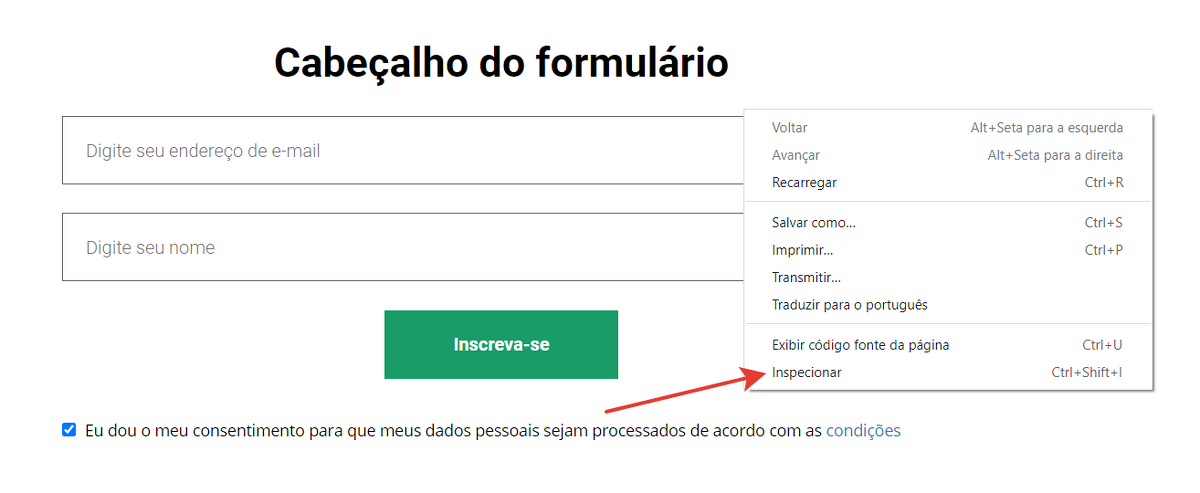 - Crie uma página vazia, adicione um formulário de cadastro e publique a página. Você também pode usar uma página já em funcionamento com o formulário.