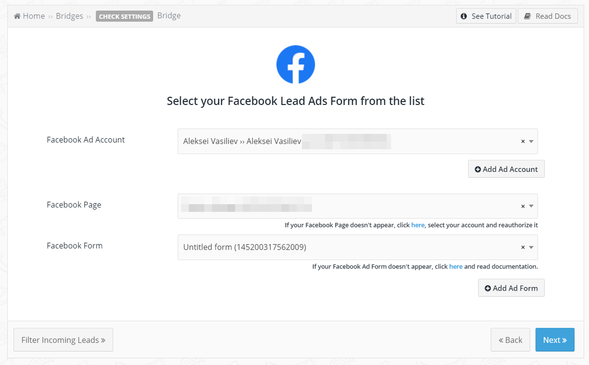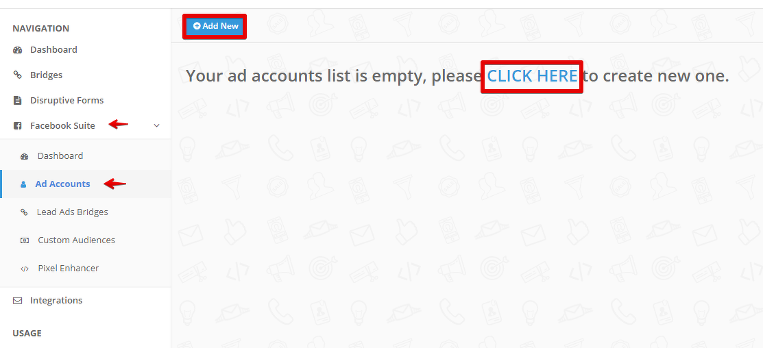 - Em sua conta pessoal na Leadsbridge, na seção Facebook Suite, adicione a conta do Facebook de onde os dados dos formulários de assinatura serão retirados.