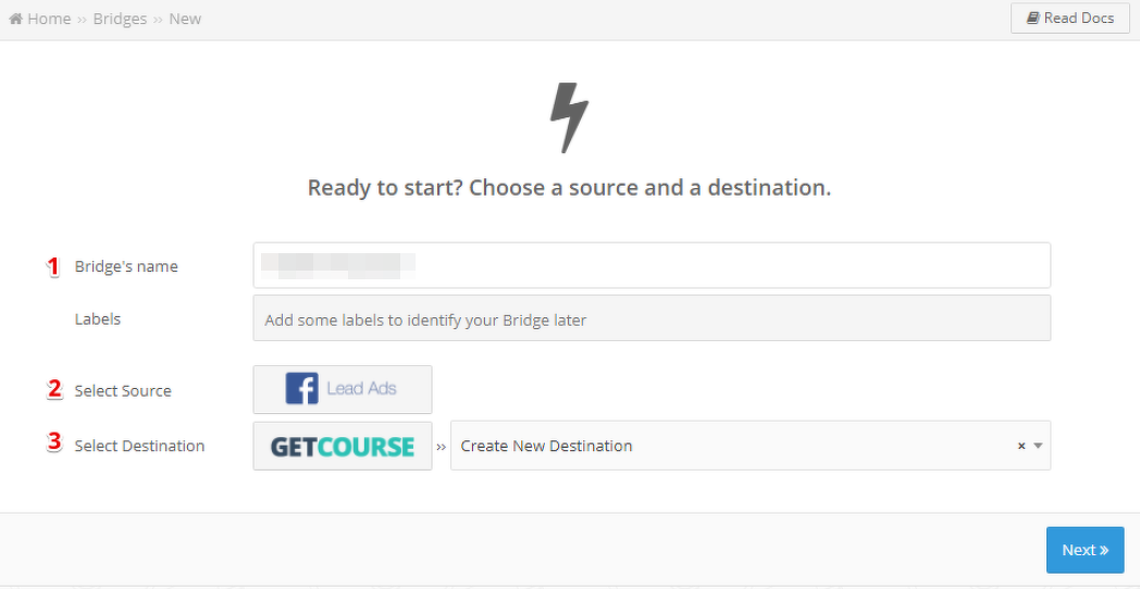 - É necessário adicionar um nome (1) para a nova integração, selecionar a fonte (2) de transferência de dados, no nosso caso é o Facebook Lead Ads, e para onde esses dados serão transferidos – GetCourse (3).