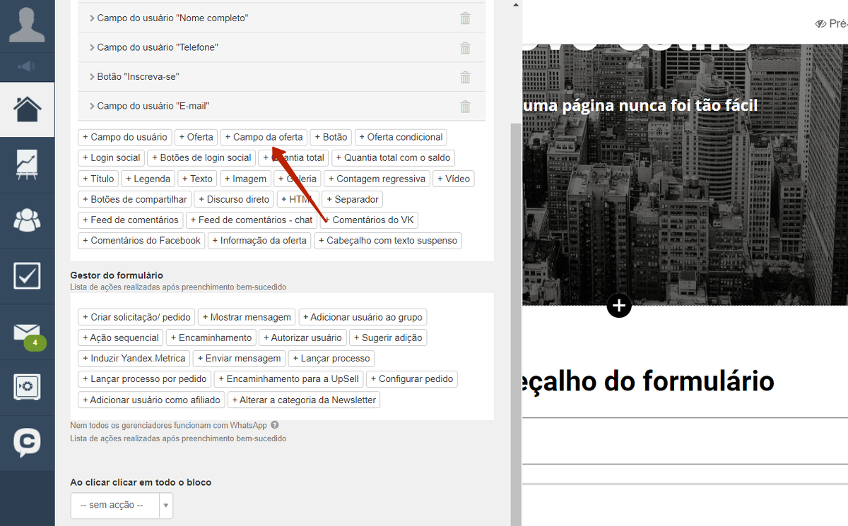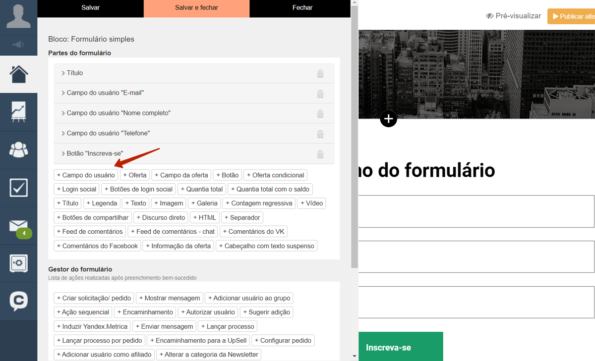 - Nas configurações do bloco, adicione o "Campo do usuário" na seção "Partes do formulário".