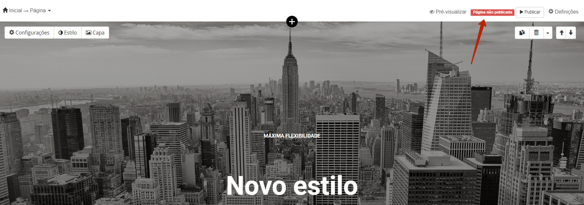 No modo de edição, uma página nova estará, por padrão, com o status "Página não publicada". Para publicá-la e torná-la visível no site, clique no botão "Publicar".