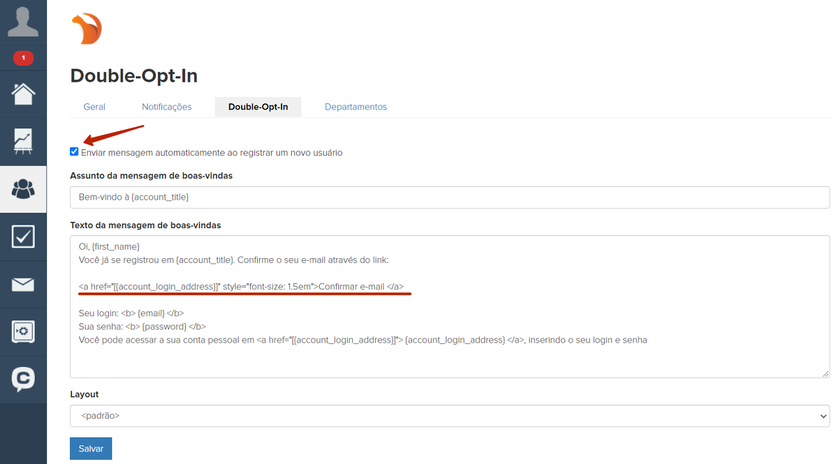 Como habilitar uma mensagem double-opt-in? Na seção “Mensagens” - “Configurações”, marque a caixa “Enviar mensagem automaticamente ao cadastrar um novo usuário”. Dessa maneira, após o cadastro, o usuário receberá uma mensagem com um pedido de confirmação do endereço de e-mail.