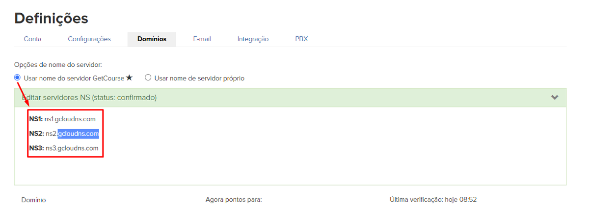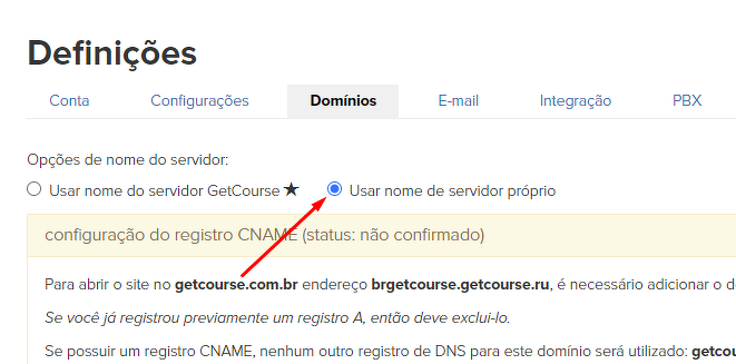 - Nas configurações de domínio, especifique a opção de colocar "No servidor NS GetCourse".