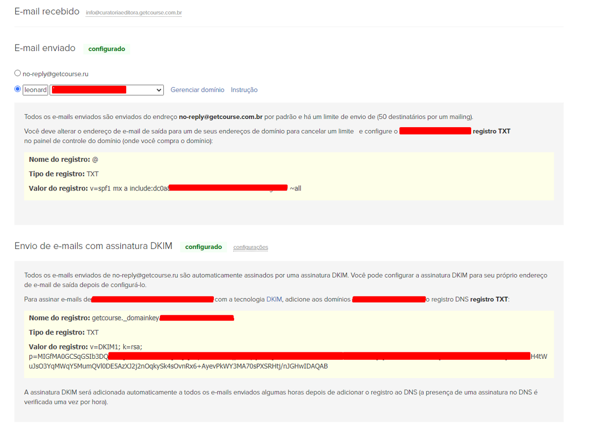 1. Se você atribuir um domínio aos servidores NS GetCourse (ou seja, sua conta abre em um endereço como o meusite.br). Nesse caso, as entradas necessárias para o envio de e-mail em nome desse domínio serão configurados automaticamente.