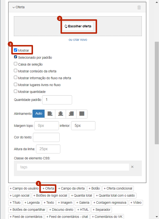 3. Assinale o item "Mostrar" para que a oferta fique visível no formulário e o usuário possa escolher uma entre várias.