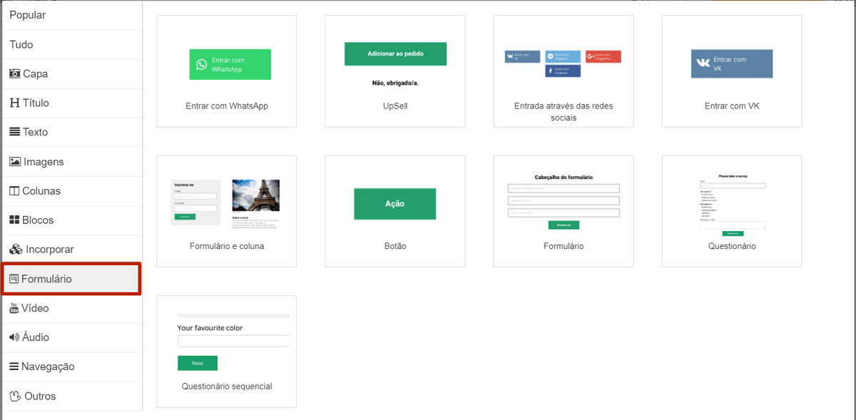 Para adicionar um formulário à página, vá até a seção "Formulário" e selecione o de sua preferência: formulário comum, formulário e coluna, botão ou questionário.