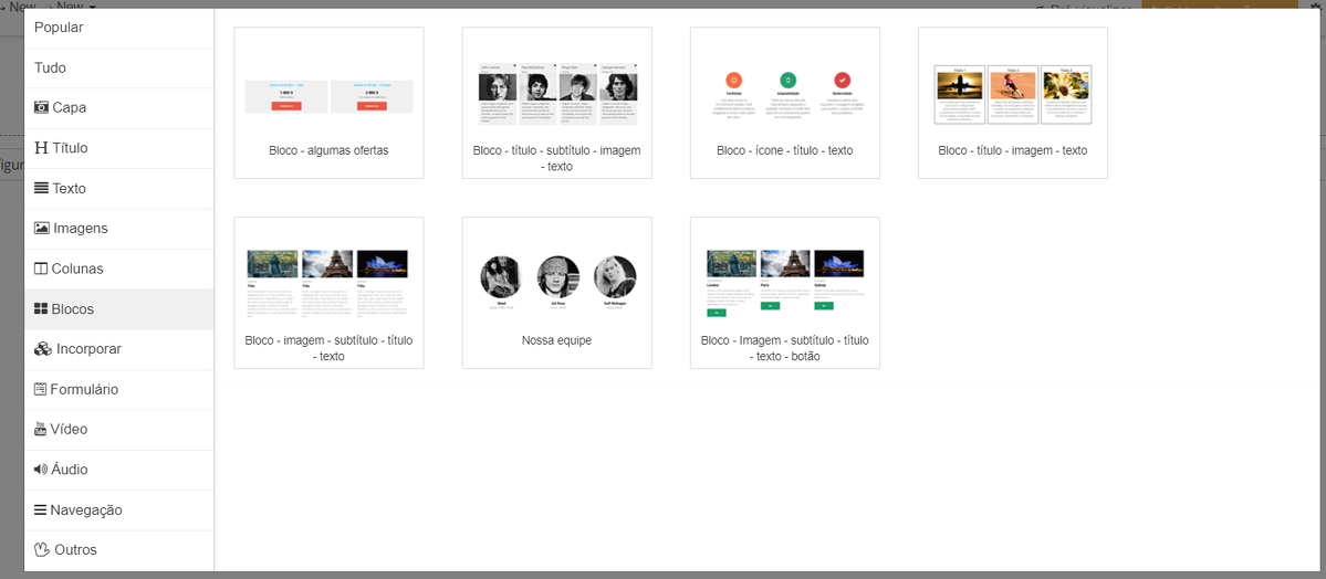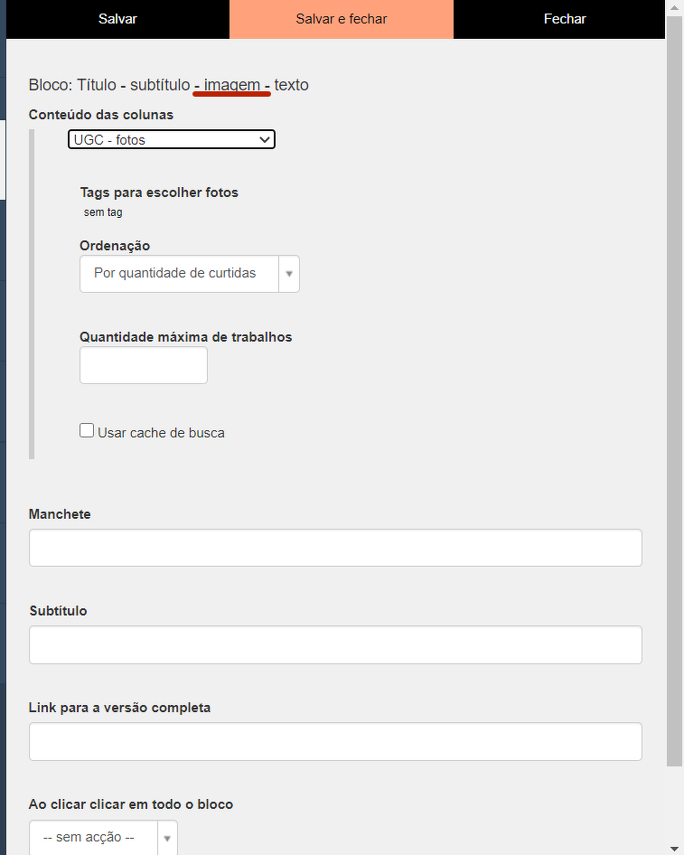 Os registros do bloco exibirão apenas os itens fornecidos pelo tipo de bloco. Por exemplo, as imagens serão exibidas nos tipos de blocos cujo nome do tipo tenha uma marca de seleção "imagem" e assim por diante.