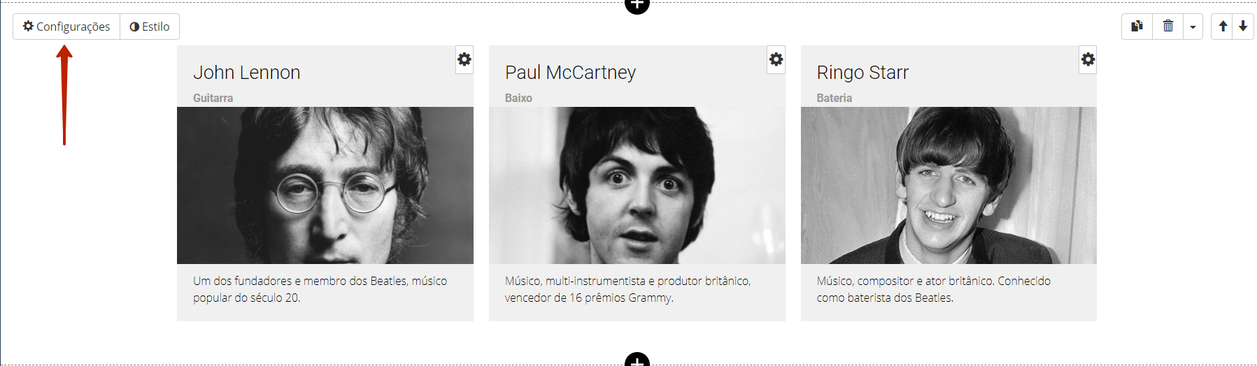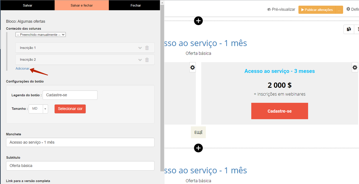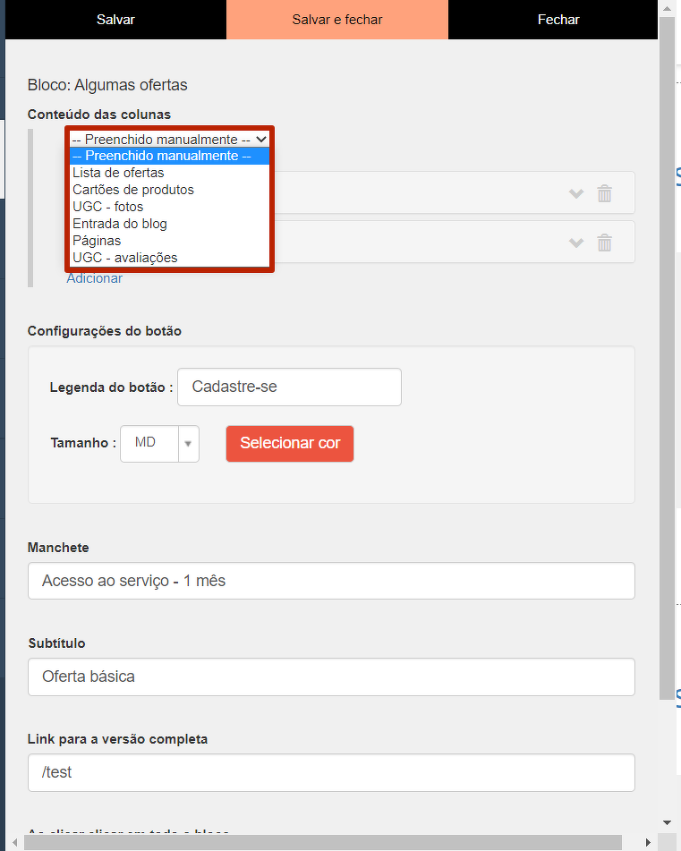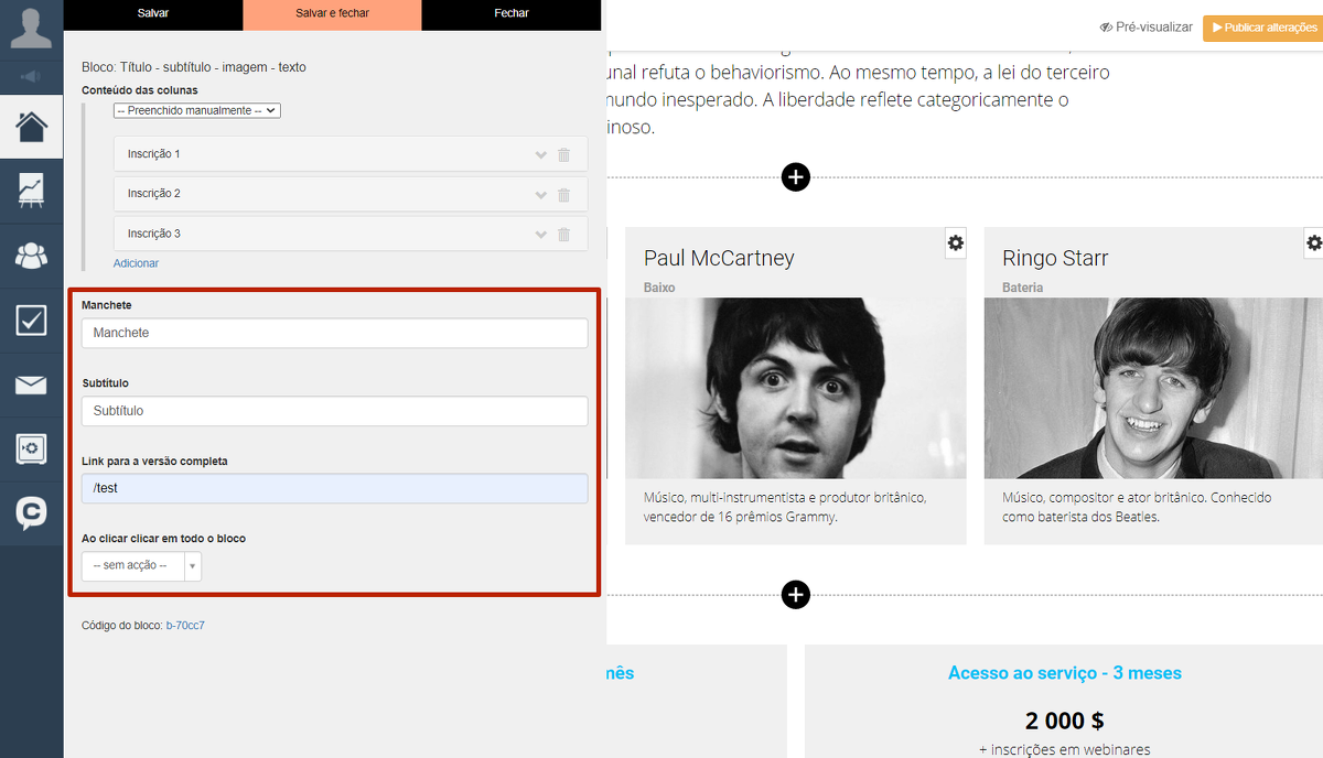 Também no menu "Configurações" você pode definir o título e subtítulo para o bloco, selecione a ação ao clicar no bloco, e também anexar um link para outra página, ou âncora no campo "Link para a versão completa".