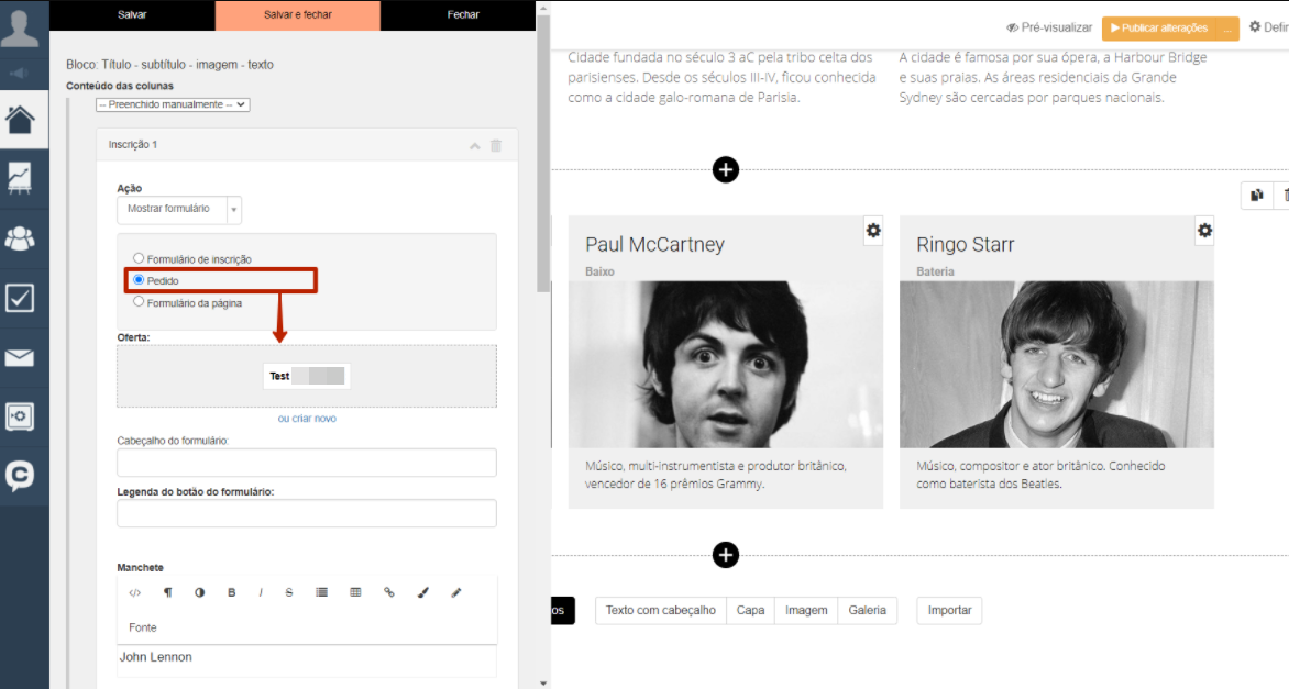Para cada entrada, você pode alterar as ações do botão. Por exemplo, você pode selecionar a ação "Mostrar formulario — Pedido" e indicar a oferta para a qual o pedido será feito.