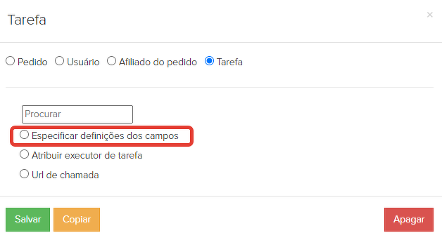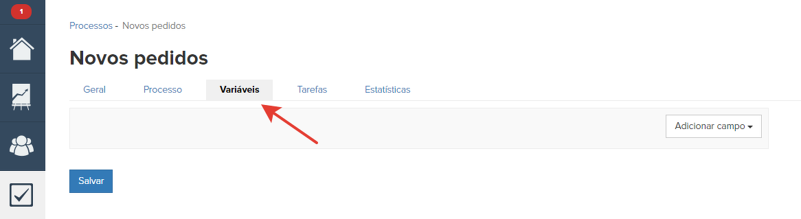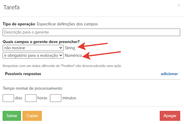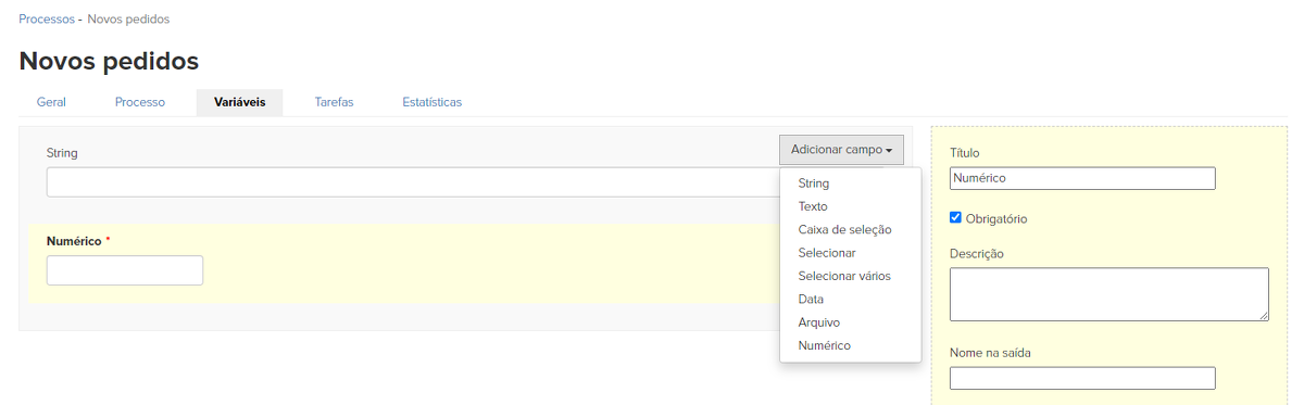 Aqui você pode criar variáveis, ou seja, campos especiais que serão utilizados pelo gerente no processamento das tarefas.