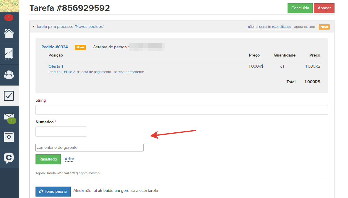 Ao processar uma tarefa, o gerente preenche os seguintes campos: