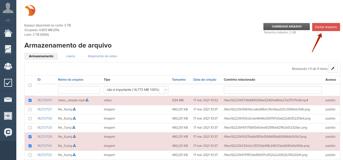 Para excluir arquivos do armazenamento de arquivos, vá até o armazenamento, selecione os arquivos que deseja excluir e clique no botão "Excluir arquivos".