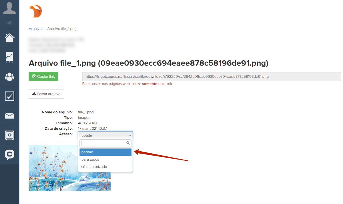 Para ver uma lista dos arquivos armazenados no GetCourse, vá em "Perfil" → "Armazenamento de arquivos".