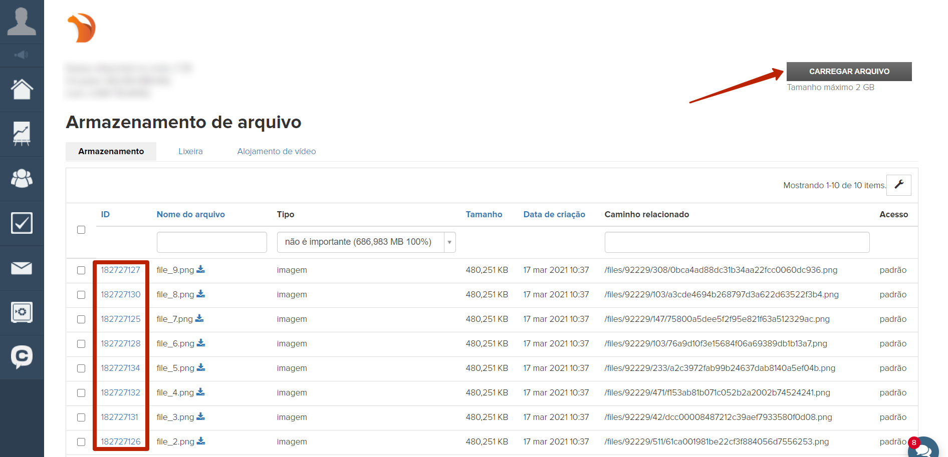 A lista de arquivos pode ser ordenada por ID, nome do arquivo, tamanho e data de criação.