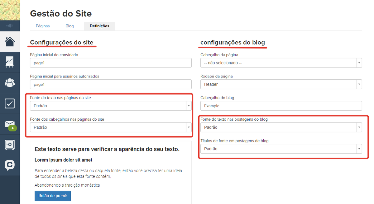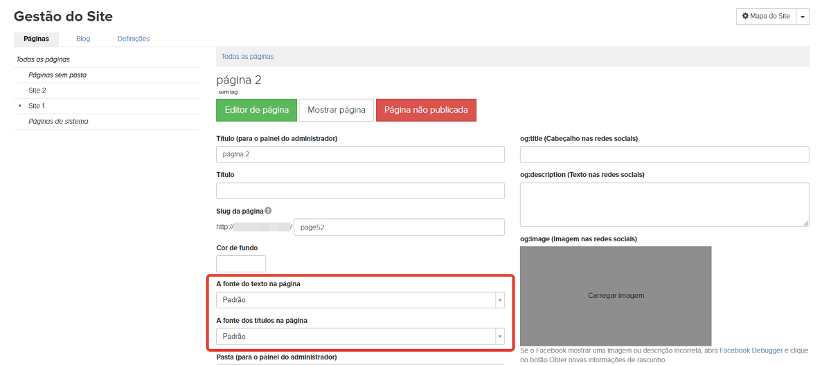 1. Para definir fontes para todas as páginas ou postagens de blog, vá para a seção "Site - Páginas" na guia "Definições" e selecione a fonte necessária para o corpo do texto ou títulos na lista suspensa
