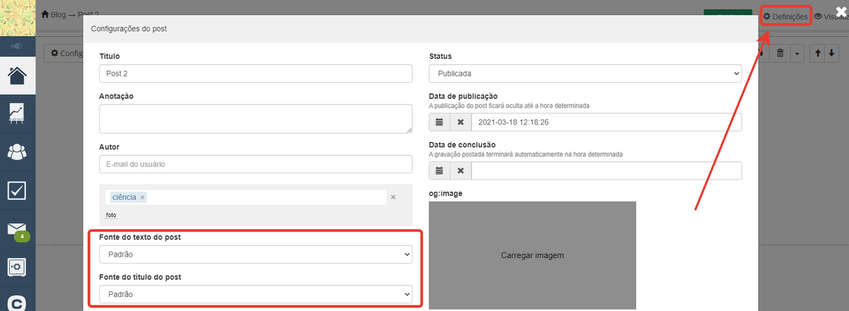Para postagens de blog, você pode definir fontes na página de edição na guia "Configurações"