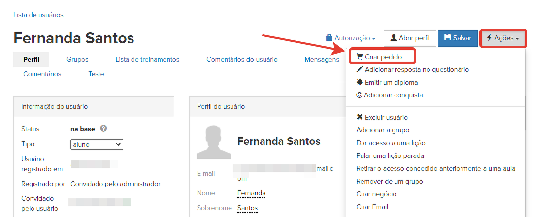Para deletar um usuário, acesse seu perfil, clique no botão "Ações" e depois em "Deletar usuário".