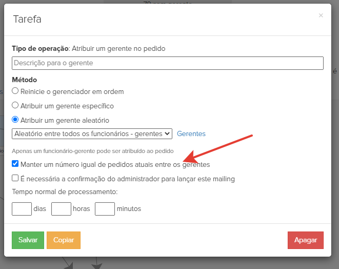 A opção "Manter igual número de pedidos atuais entre os gerentes" permite distribuir os pedidos entre os funcionários selecionados, levando em consideração os pedidos que eles já possuem.