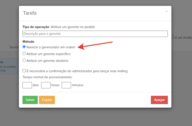 - "Gerente aleatório da lista" - um gerente será selecionado dos indicados na lista.