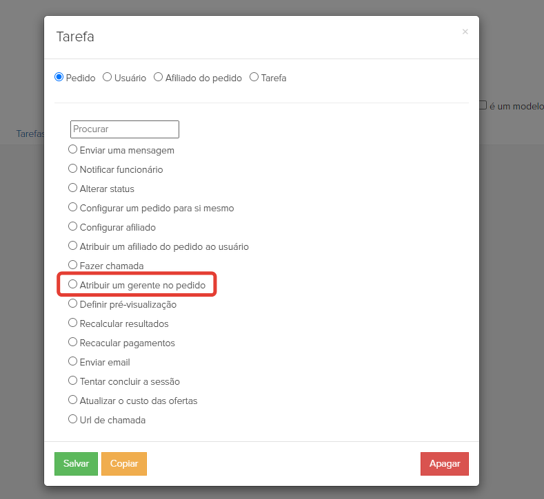 Em processo para o objeto Pedidos, é possível designar um gerente de pedidos. Para isso, uma especial operação "Atribuir um gerente no pedido."