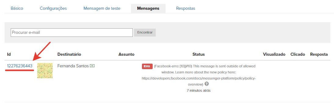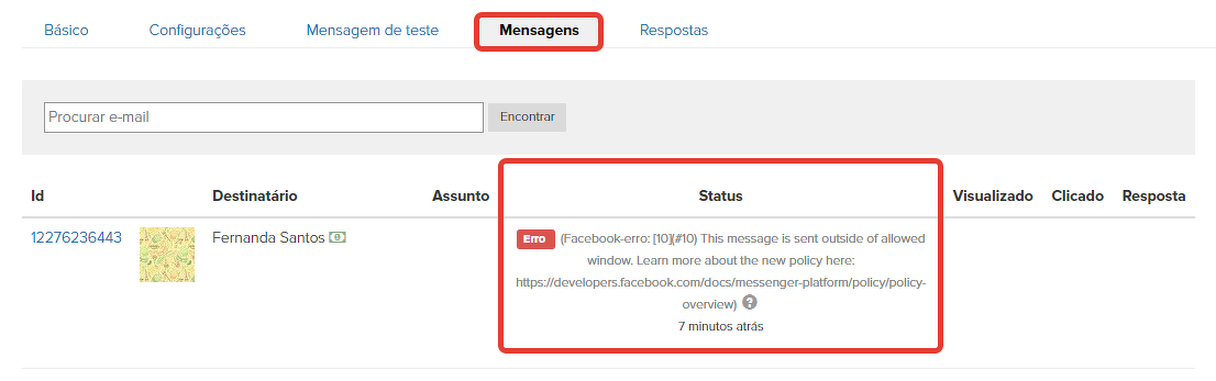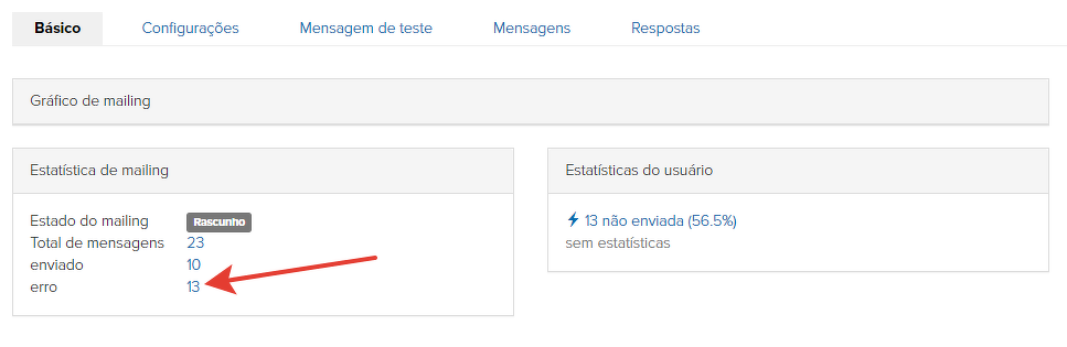 As mensagens com o status "Erro" podem ser visualizadas nas estatísticas de cada mensagem (mailing) enviado.