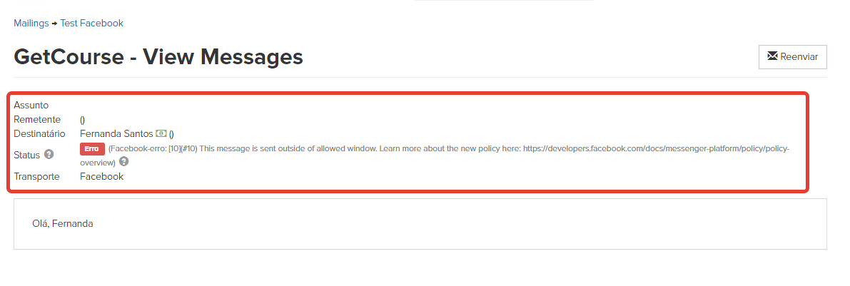 - Erro do Facebook: [10](#10) Esta mensagem é enviada fora da janela permitida.